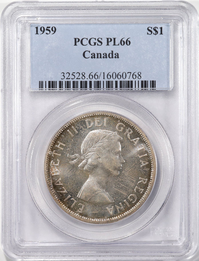 1959 Canada 1 Dollar graded PL-66 by PCGS. A superb gem, lustrous and boldly struck. Some peripheral toning on the obverse, reverse is scattered with tobacco hues and flecks of gold toning.